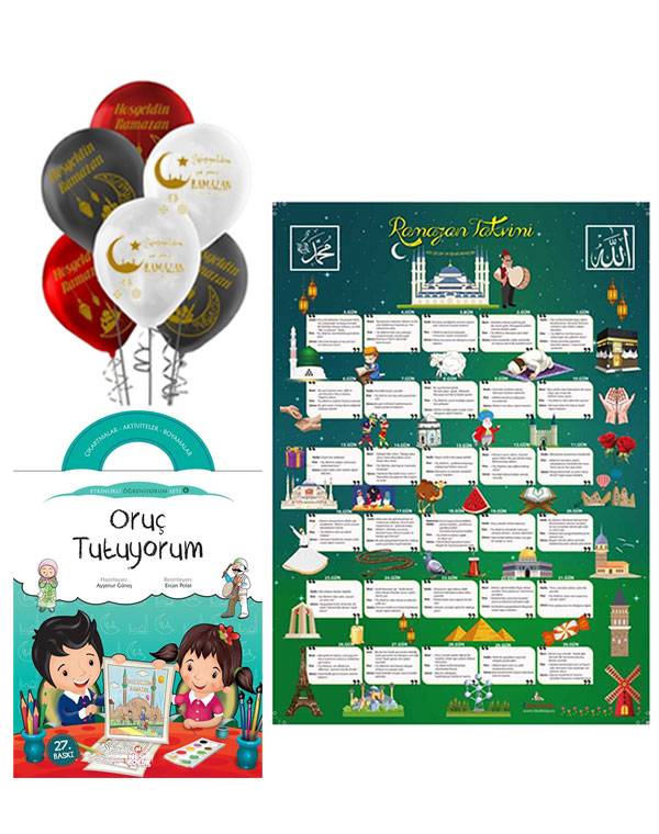 - 1 Adet Oruç Tutuyorum Etkinlik kitabı, 1 adet Ramazan Takvimi, 6 adet Balon karışık renkli toplam 3 adet ürün sette yer almaktadır.
